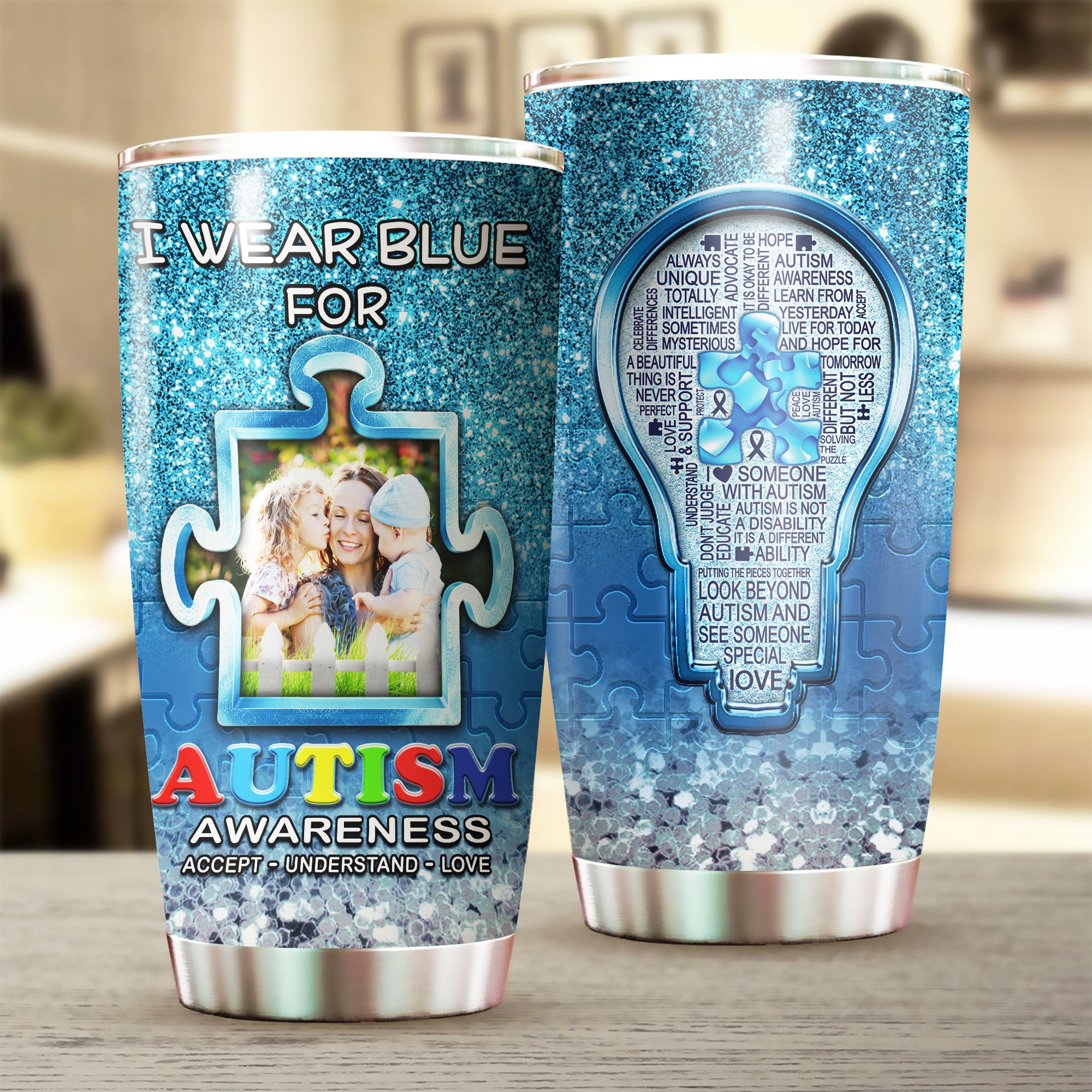 Autism Mug Customize Your Photo  I Wear Blue For Autism Awareness Mug Stainless Steel Tumbler 20 Oz Gift For Autism Awareness