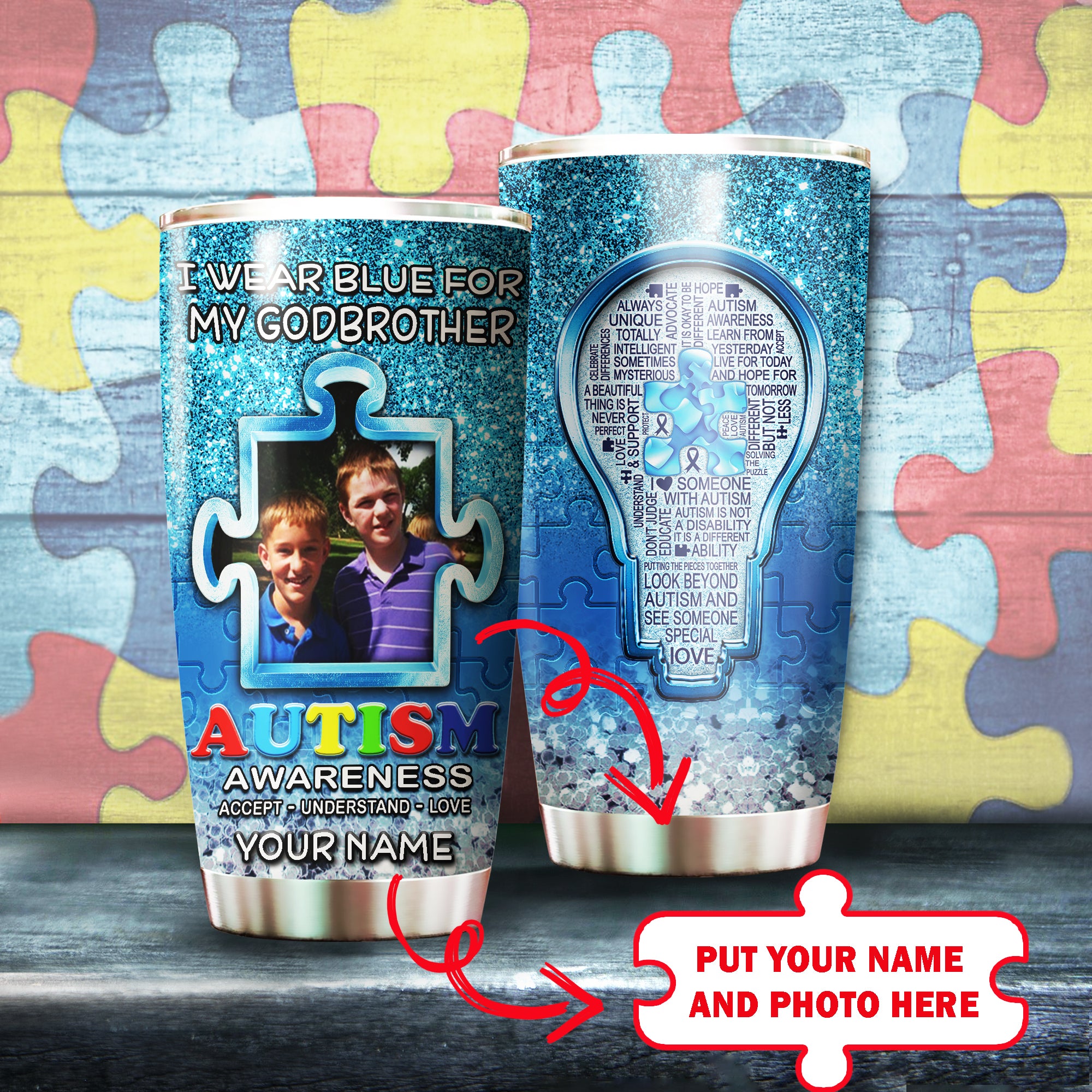 Autism Mug Customize Your Godbrother Photo I Wear Blue For My Godbrother Mug Stainless Steel Tumbler 20 Oz Gift For Autism Awareness