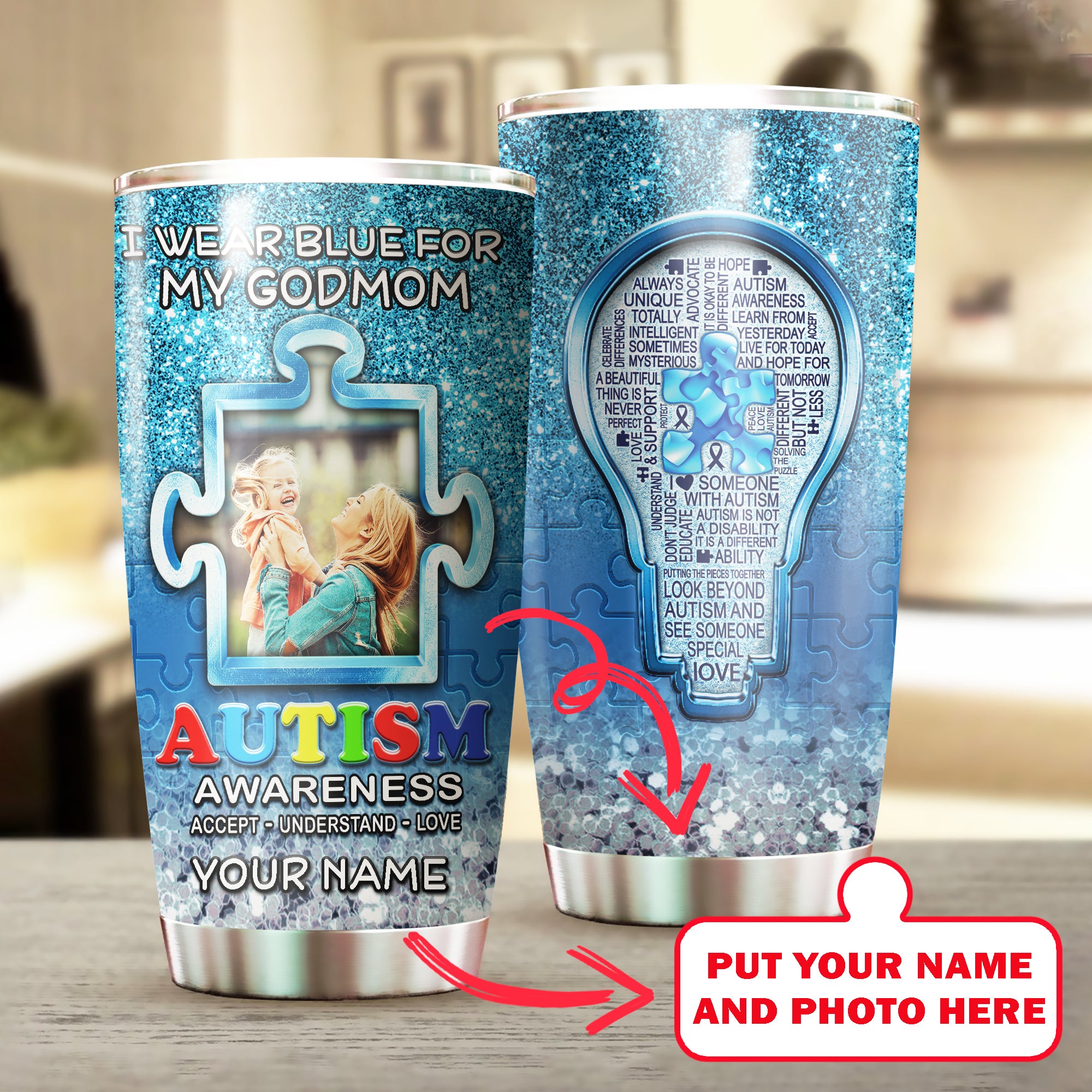 Autism Mug Customize Your Godmom Photo I Wear Blue For My Godmom Mug Stainless Steel Tumbler 20 Oz Gift For Autism Awareness