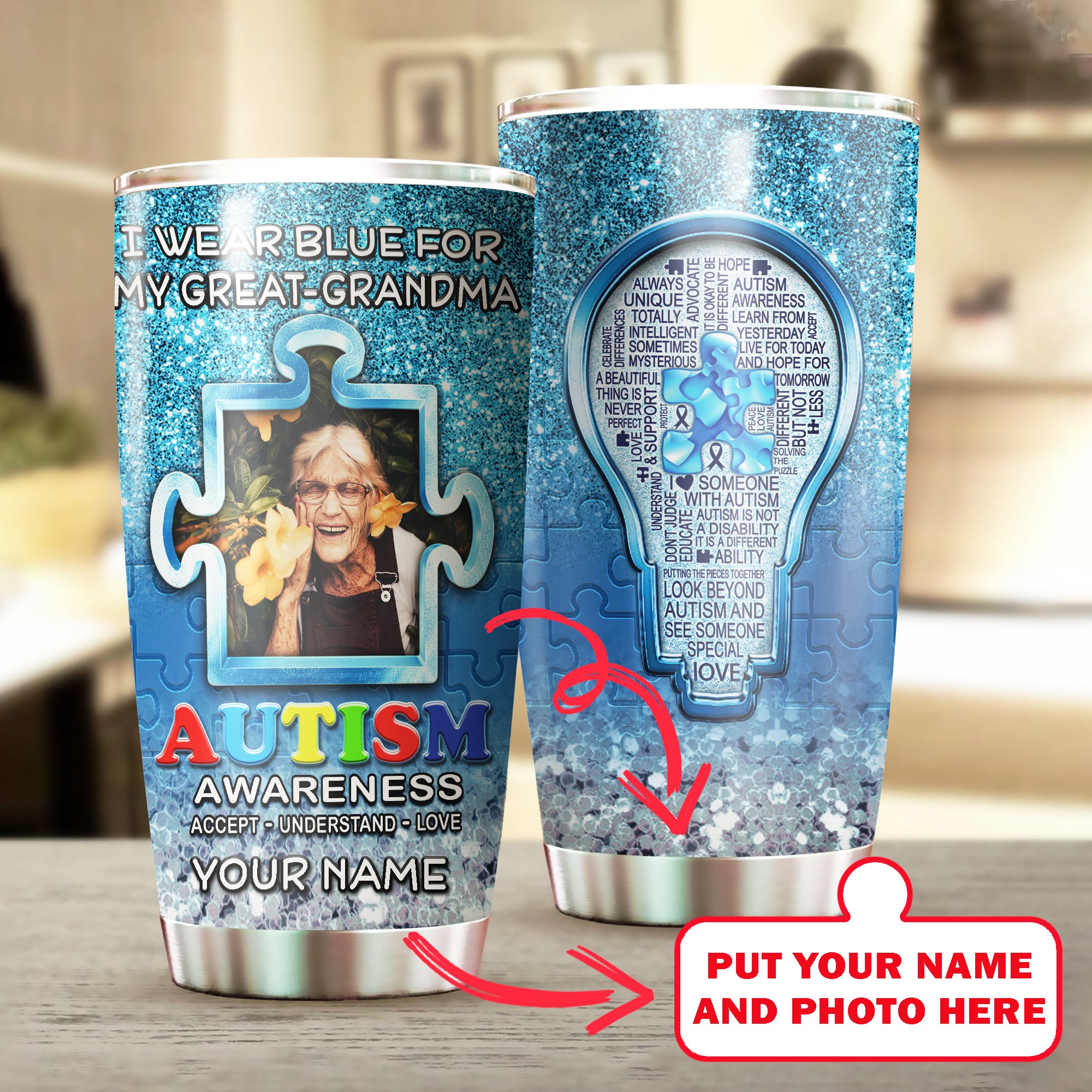 Autism Mug Customize Your Great Grandma Photo  I Wear Blue For My Great Grandma Mug Stainless Steel Tumbler 20 Oz Gift For Autism Awareness