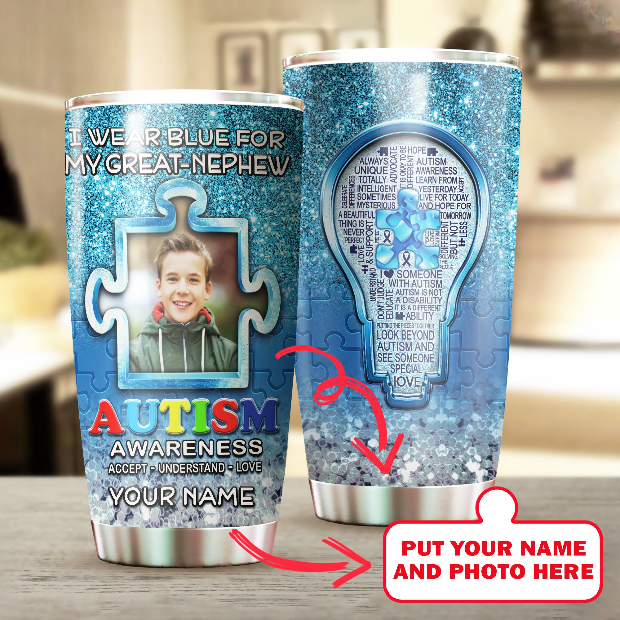 Autism Mug Customize Your Great Nephew Photo I Wear Blue For My Great Nephew Mug Stainless Steel Tumbler 20 Oz Gift For Autism Awareness