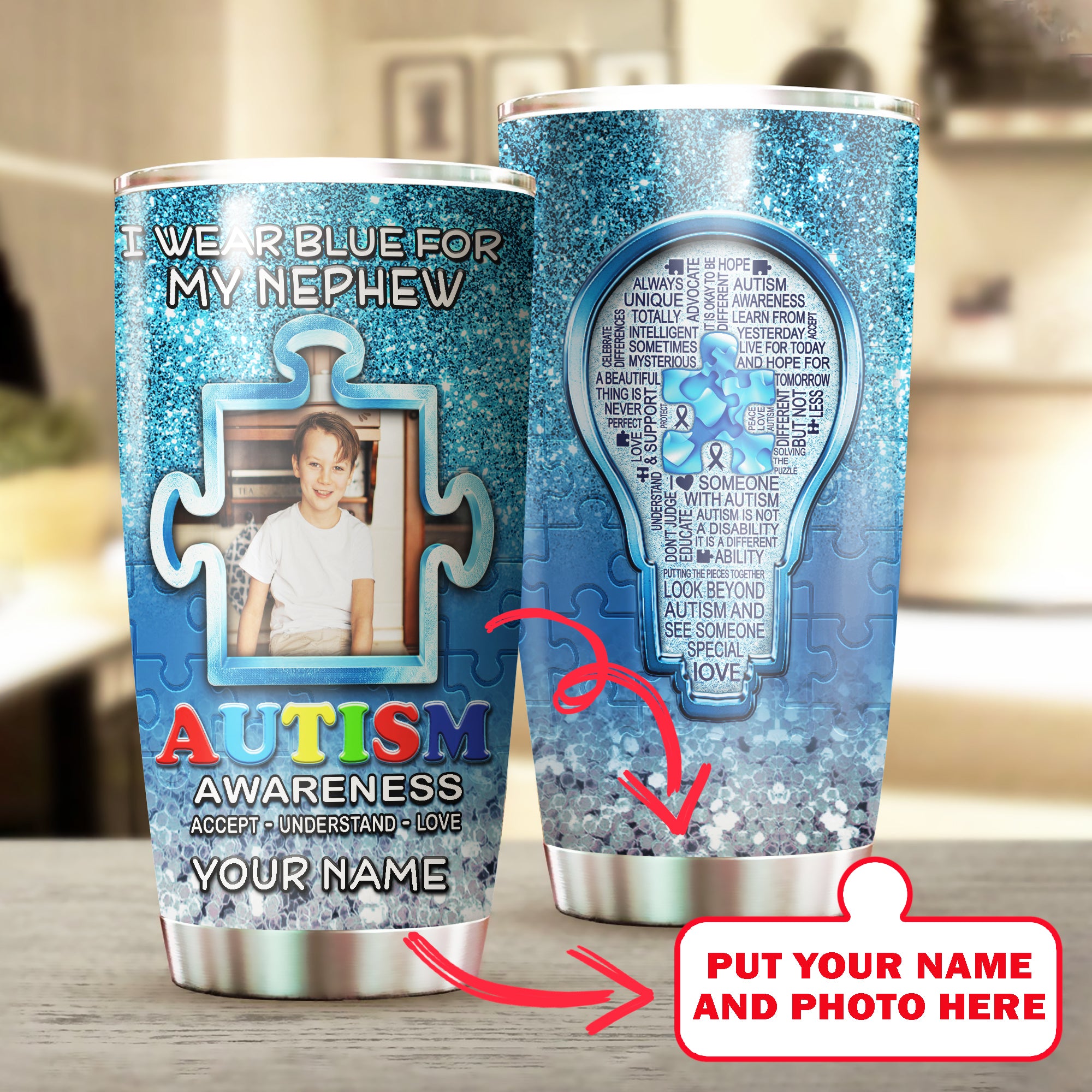 Autism Mug Customize Your Nephew Photo  I Wear Blue For My Nephew Mug Stainless Steel Tumbler 20 Oz Gift For Autism Awareness