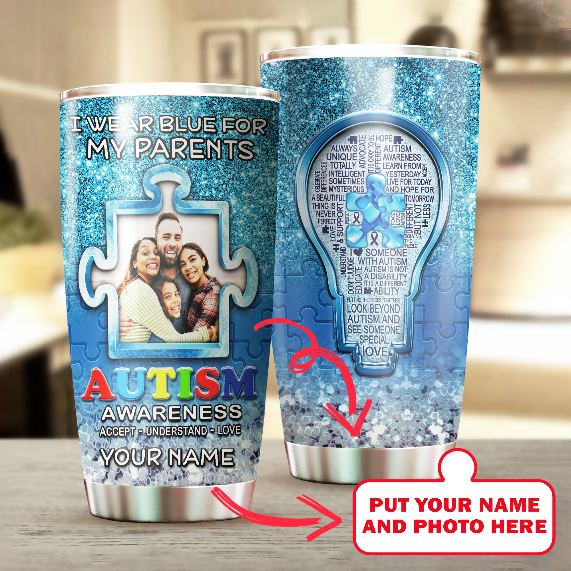 Autism Mug Customize Your Parents Photo  I Wear Blue For My Parents Mug Stainless Steel Tumbler 20 Oz Gift For Autism Awareness