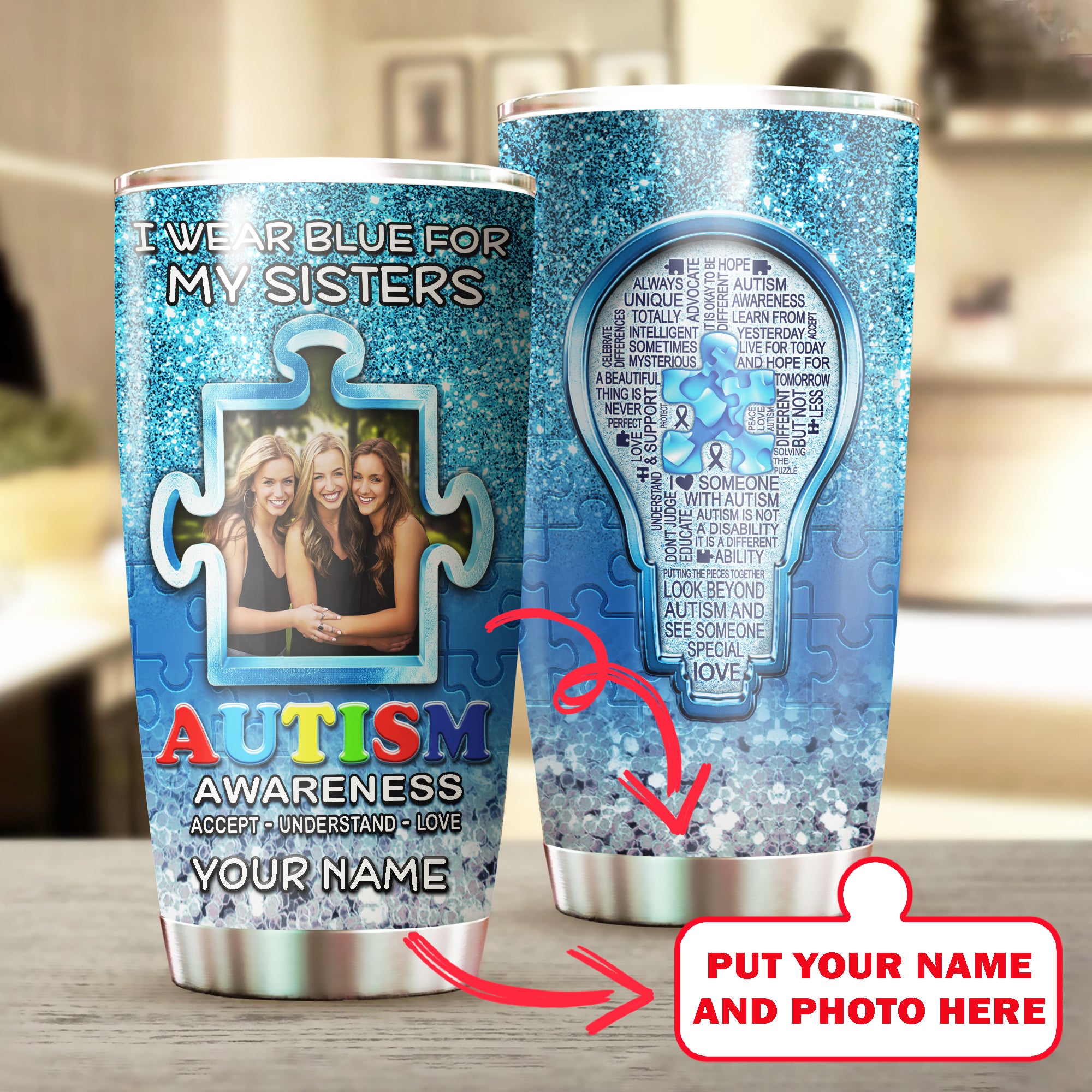 Autism Mug Customize Your Sisters Photo  I Wear Blue For My Sisters Mug Stainless Steel Tumbler 20 Oz Gift For Autism Awareness